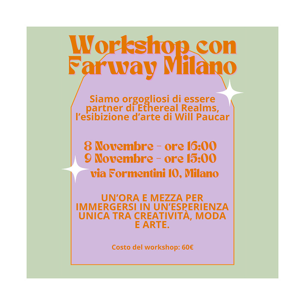 L’8 e il 9 novembre, tra le luci e i profumi della galleria, i bambini dai 5 anni in su saranno guidati dalla designer Farwa Zulfiqar, fondatrice di Farway Milano, in un viaggio creativo ispirato ai “Reami Eterei” dell’artista.