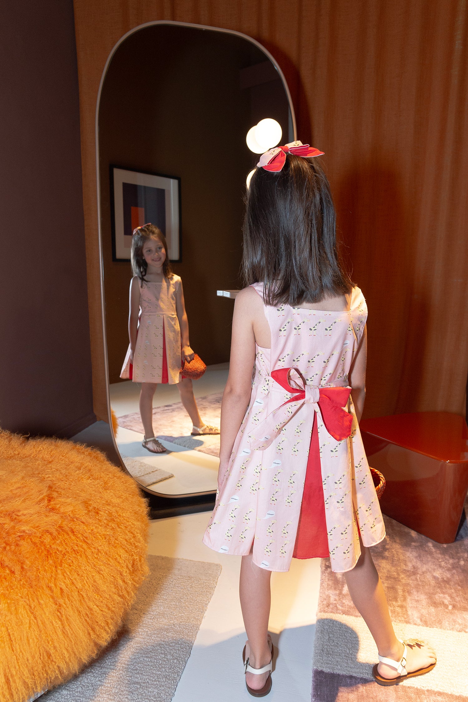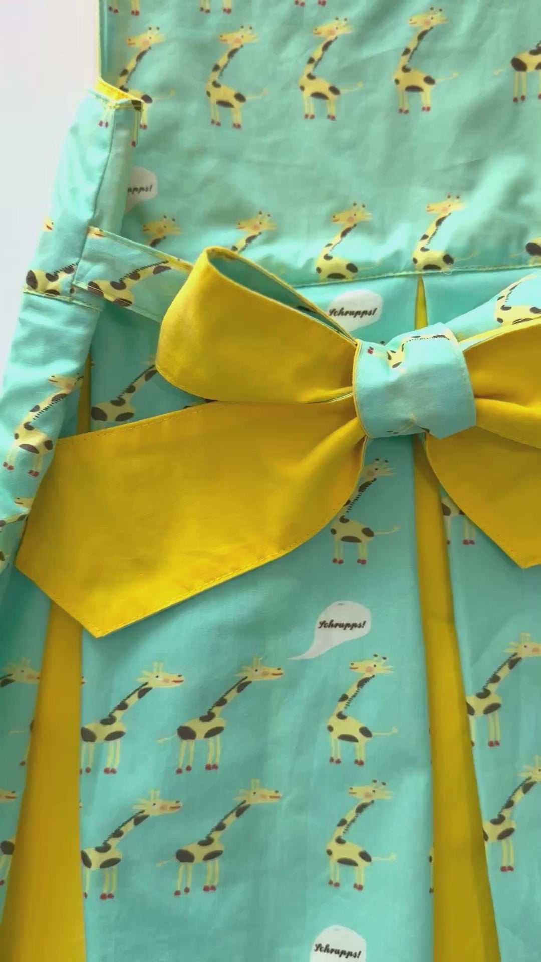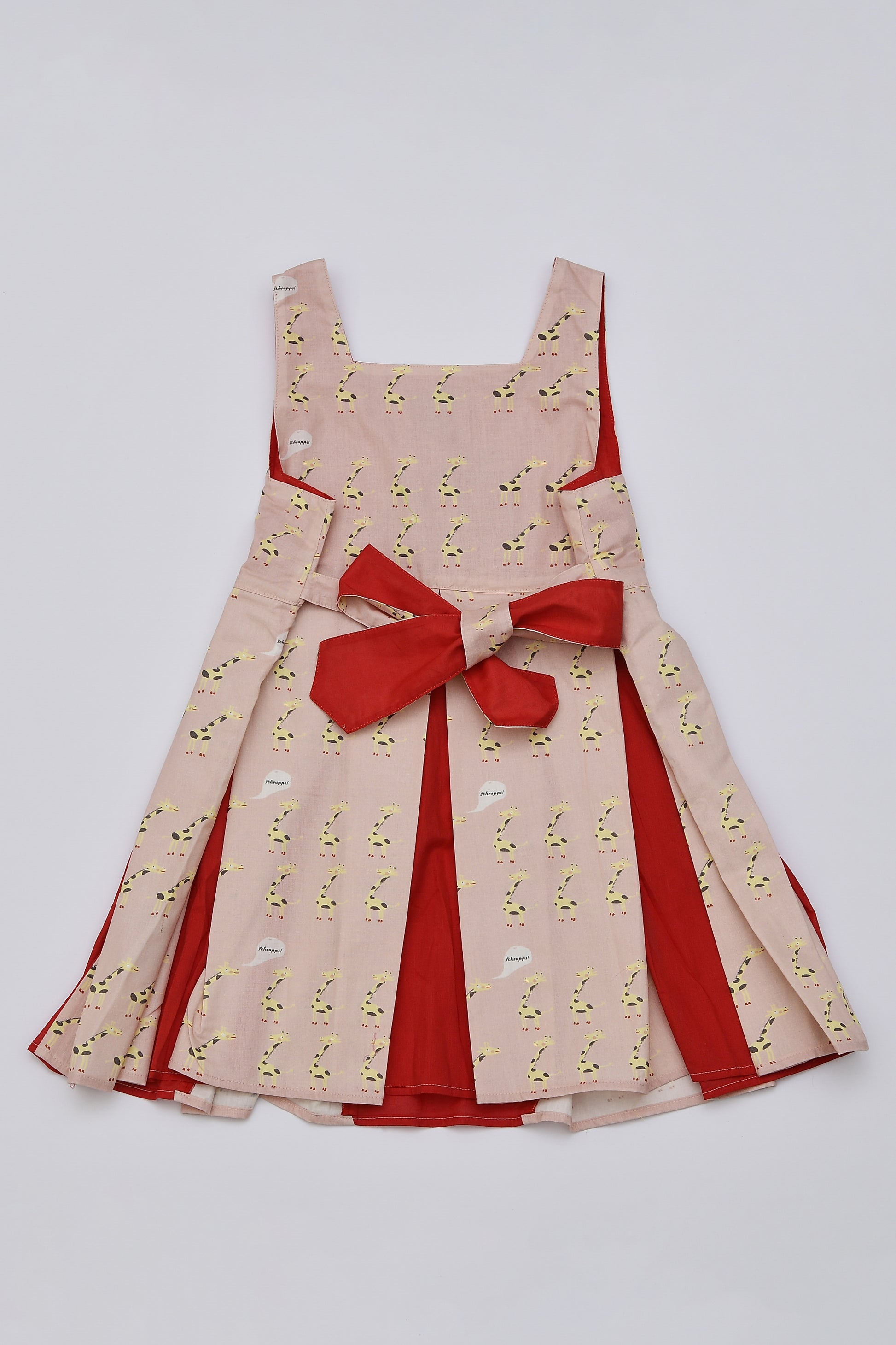Vivi con audacia e sostenibilità con l'abito Masha! Realizzato in lussuoso cotone biologico al 100%, questo vestito senza maniche presenta uno scollo squadrato Farway e un grazioso fiocco bicolore. Scegli la stampa Giraffe giocose su rosa con voile rosso o su un vivace turchese con voile giallo.