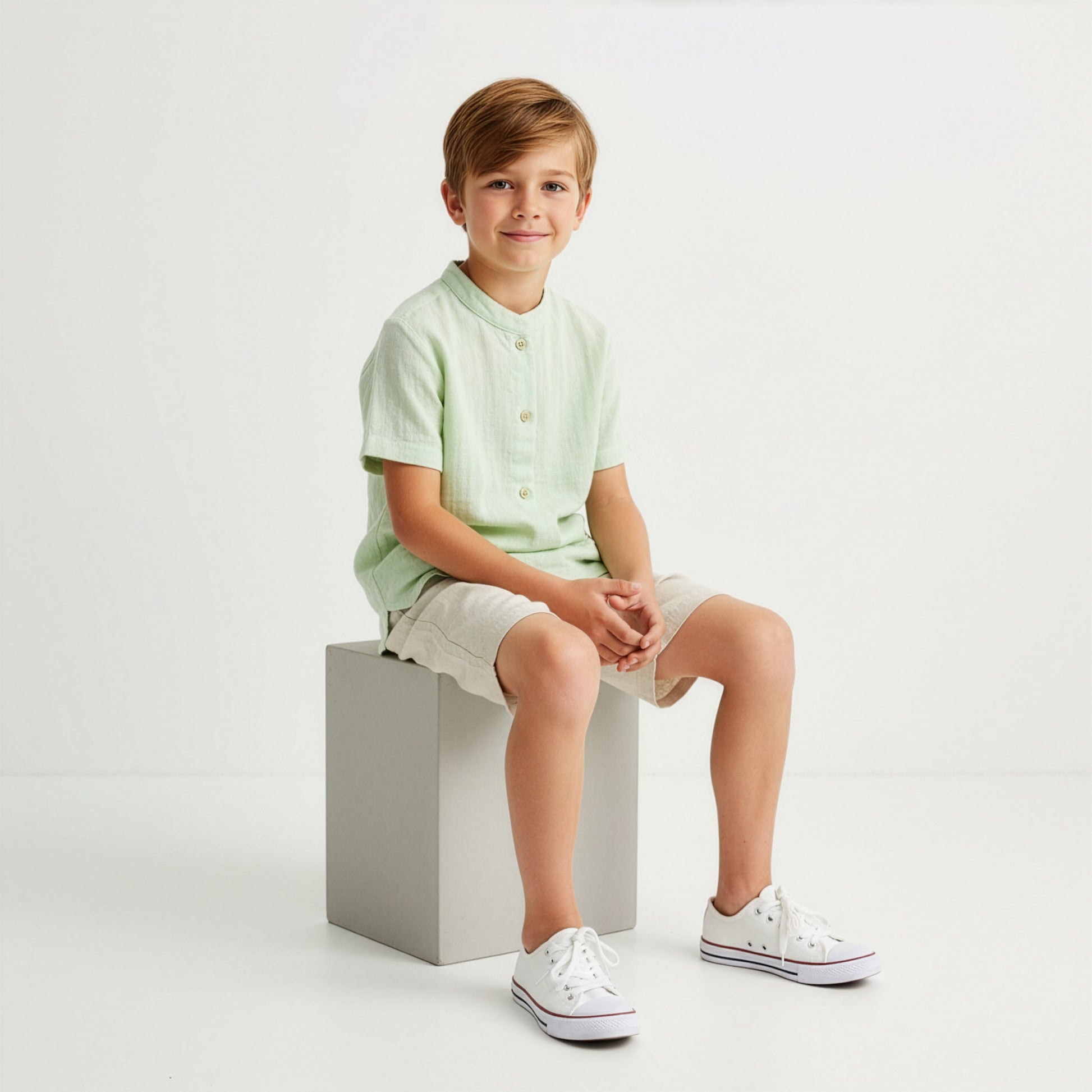 Camicia a maniche corte con collo alla coreana, perfetta in ogni occasione.